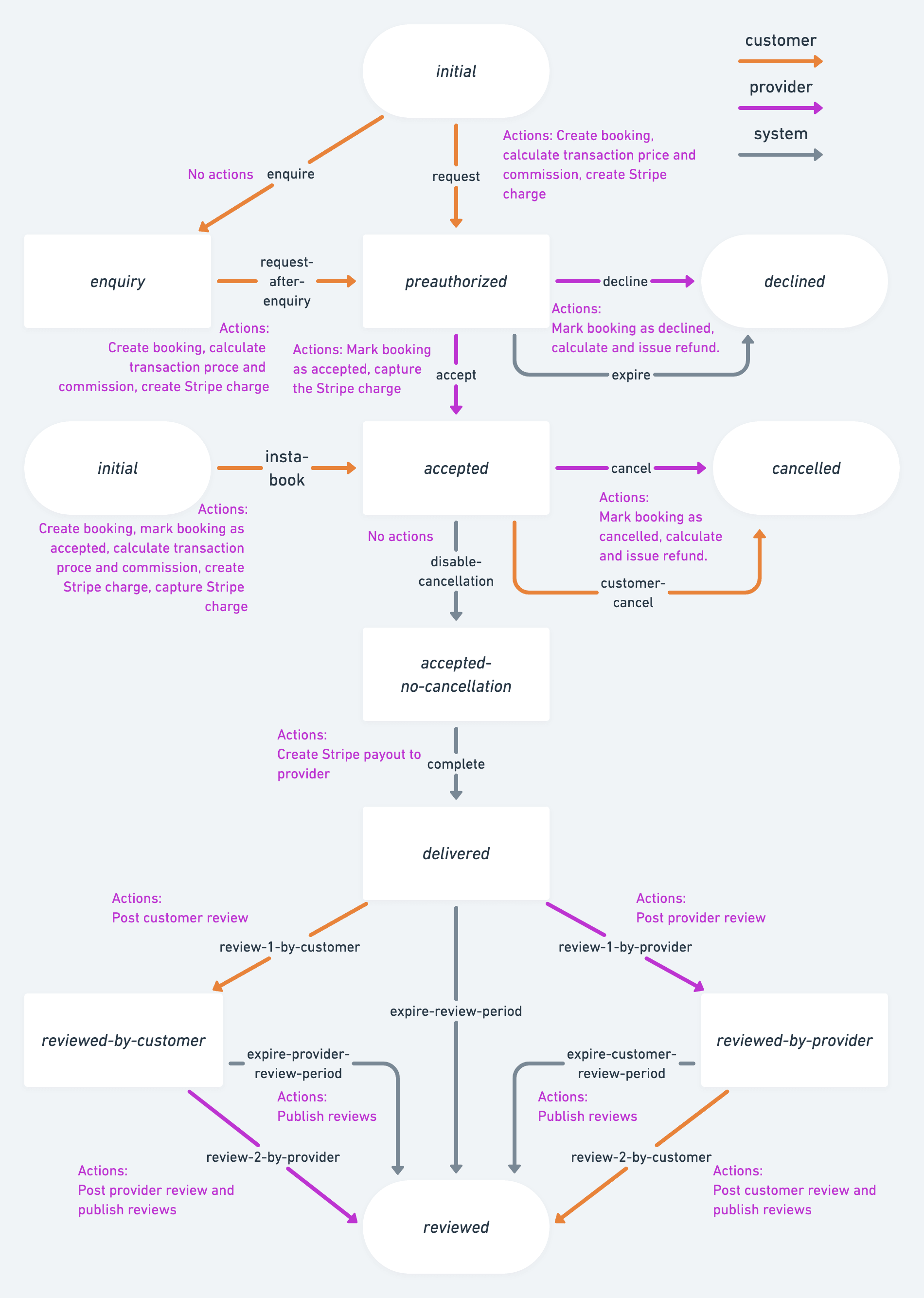 Actions describe what happens as part of a transition. For example, the transaction process allows users to transition from accepted state to delivered or cancelled. The transaction may “complete” automatically, or the operator may “cancel” it with the respective transitions. “Complete” actions involve creating a payout to the provider via Stripe (Flex’s payment gateway). “Cancel” actions, on the other hand, include cancelling the booking and issuing a refund.